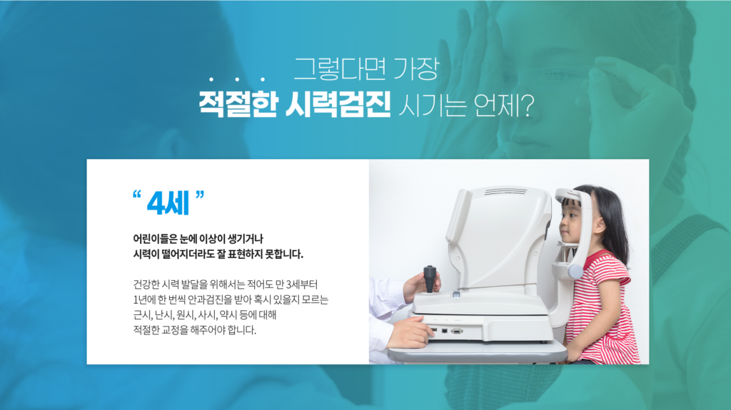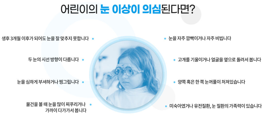소아검진 소중한 내아이.생애 주기별 조기 검진으로 아이의 시력을 지켜주세요!아이들에게 나타나는 질환은 발견 시기가 늦을 경우 치료가 어렵고 영구적인 시력장애로 남을 수 있는 만큼 조기 발견과 치료가 매우 중요합니다. 아이들의 시력 발달과정? 시력발달이 가장 활발하게 이루어지는 시기는 학동기(7세) 이전으로 학교에 입학한 후에는 대부분의 시력발달이 멈추기 때문에 치료시기를 놓칠 수 있습니다. 시력발달이 가장 활발하게 이루어지는 시기는 학동기(7세) 이전으로학교에 입학한 후에는 대부분의 시력발달이 멈추기 때문에 치료시기를 놓칠 수 있습니다. 출생직후 > 생후 3~4개월 > 3~5세 > 5~6세 생후 2~3개월 [ 0.1 ] 생후 5~6개월 [ 0.2 ] 생후 1년 [ 0.3 ] 4~5세 [ 0.7 ] 7~8세 [ 1.0 ] 생후 2~3개월 [ 0.1 ] 생후 5~6개월 [ 0.2 ] 생후 1년 [ 0.3 ] 생후 4~5세 [ 0.7 ] 생후 7~8세 [ 1.0 ]